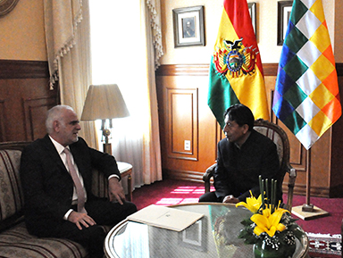 Este acto se realiza previamente a la entrega de Cartas Credenciales al presidente del Estado, Evo Morales Ayma.