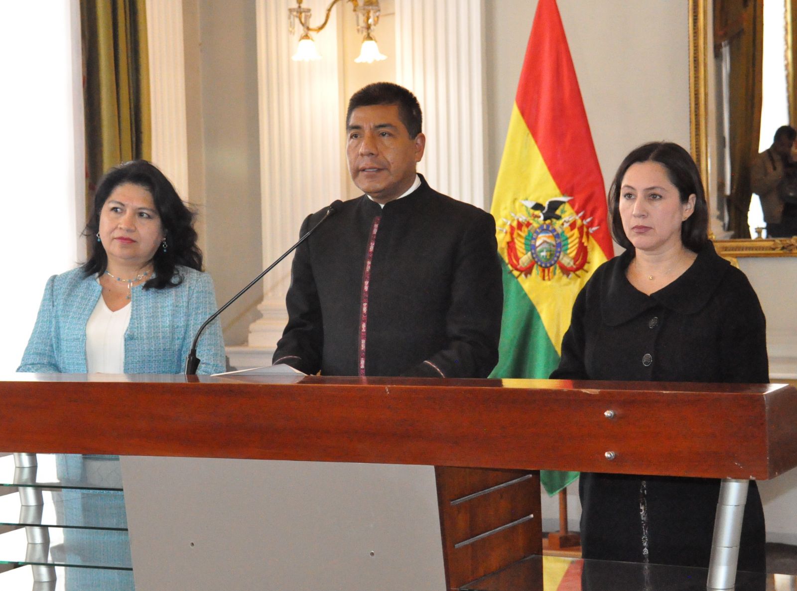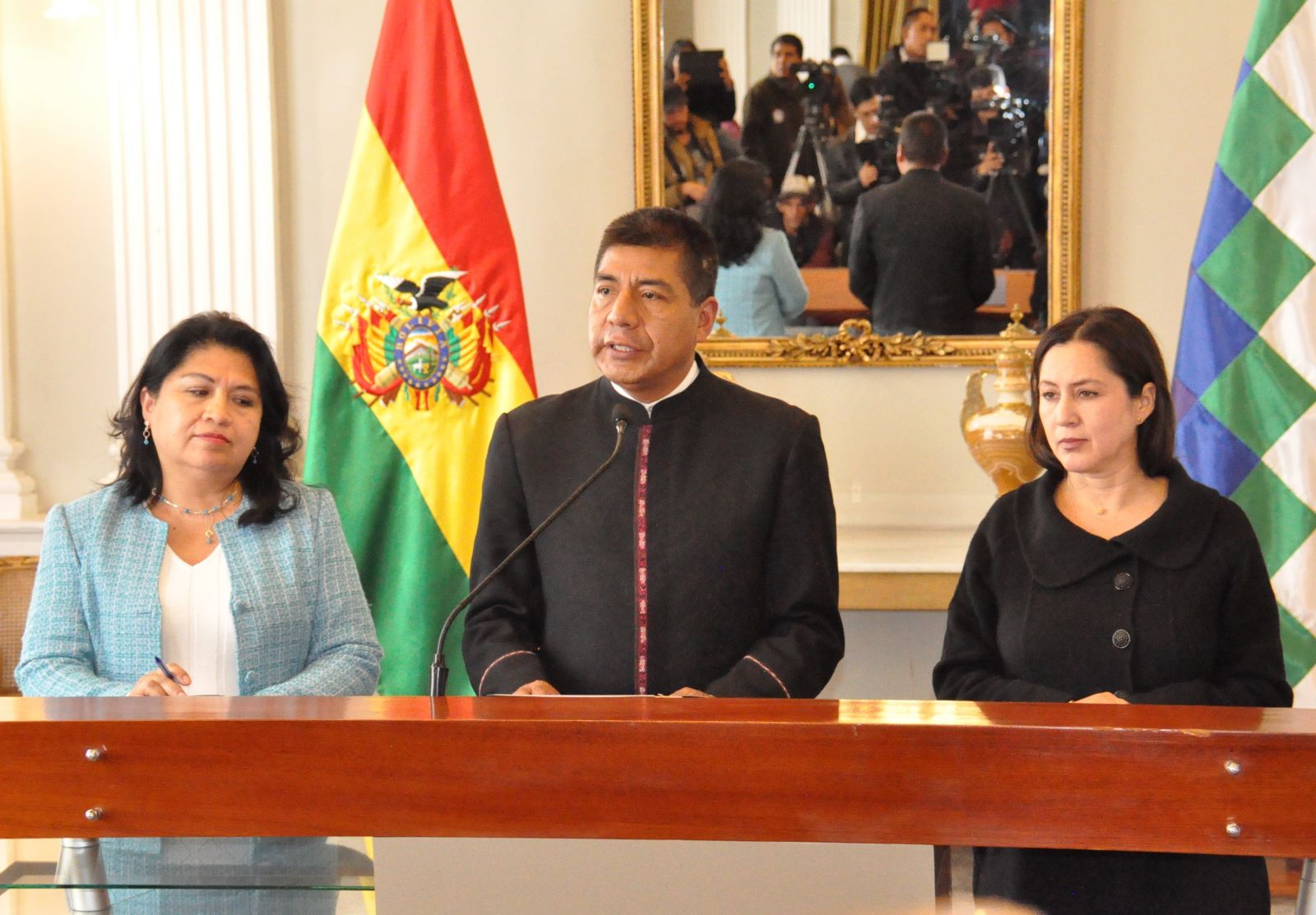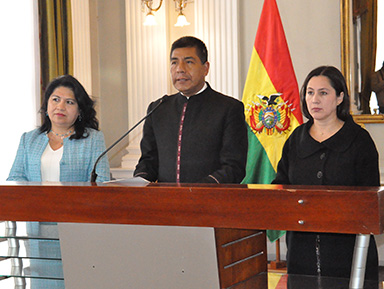 Viceministra Palomeque, Canciller Huanacuni y Viceministra Almendras.