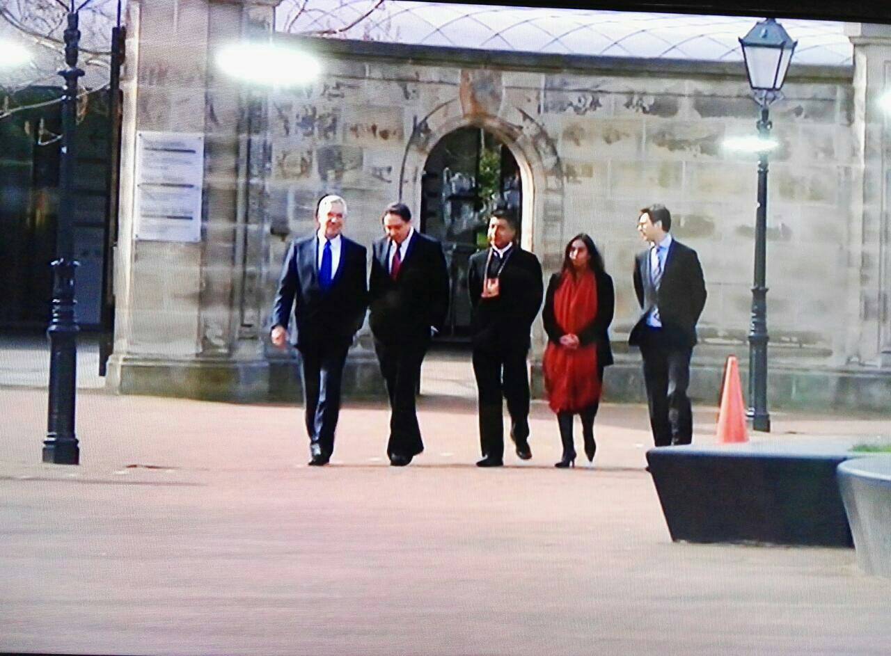 Comitiva boliviana saliendo de la CIJ de La Haya.