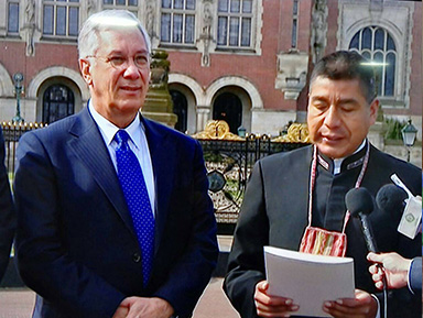 La comitiva boliviana en La Haya, a la cabeza del canciller Fernando Huanacuni, el agente Eduardo Rodríguez, la presidenta de la Cámara de Diputados, Gabriela Montaño y el ministro de Justicia Héctor Arce entregaron la réplica boliviana de la demanda marítima ante la Corte Internacional de Justicia (CIJ) de La Haya.