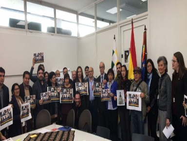 La comunidad boliviana y latinoamericana residente en Europa, anoticiada de las gestiones que el Canciller Fernando Huanacuni está realizando en Ginebra, Suiza, relativas a la detención arbitraria e injusta de 9 Ciudadanos Bolivianos en Chile, transmitió sus muestras de solidaridad, su voz de aliento y confianza en las acciones que realiza el Gobierno de Bolivia para su pronta liberación.