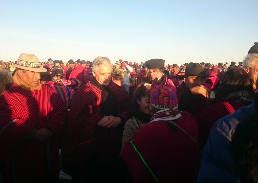 El Vicepresidente Álvaro García Linera y el Canciller Fernando Huanacuni Mamani recibieron este miércoles el Año Nuevo Andino Amazónico y del Chaco 5525 en el municipio milenario de Tiwanaku, principal sitio arqueológico distante a 72 kilómetros de la ciudad de La Paz.