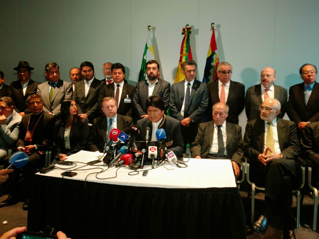 Morales rememoró la aprobación de la resolución de 1979 de la Organización de Estados Americanos (OEA), instancia hasta donde llegó el conflicto marítimo donde claramente se afirma: “Es de interés hemisférico permanente encontrar una solución equitativa por la cual Bolivia obtenga acceso útil y soberano al Océano Pacífico”, y concluye con la recomendación: “(Para tal respecto) se inicien negociaciones encaminadas a dar a Bolivia una conexión territorial libre y soberana con el Océano pacifico”.