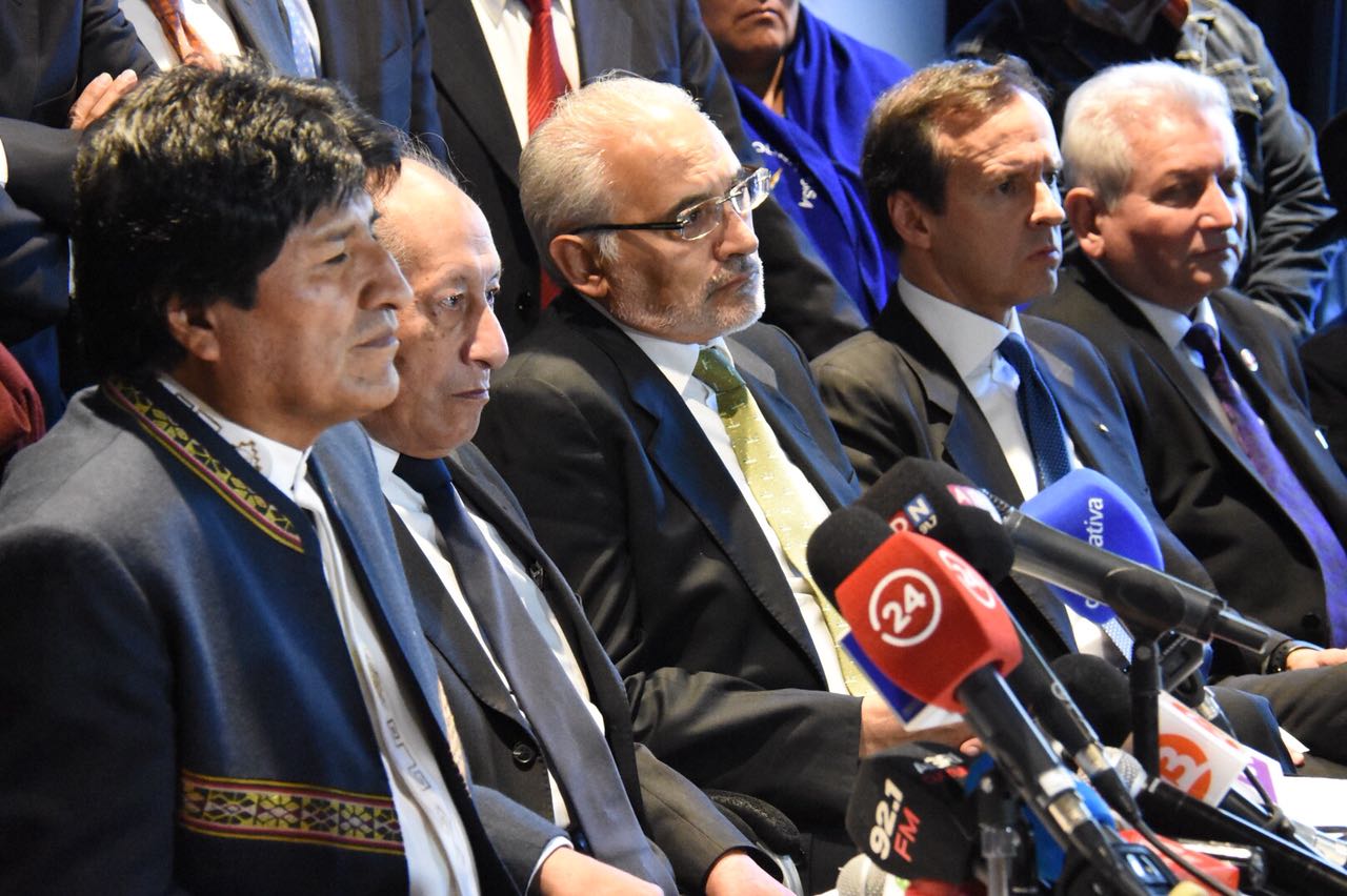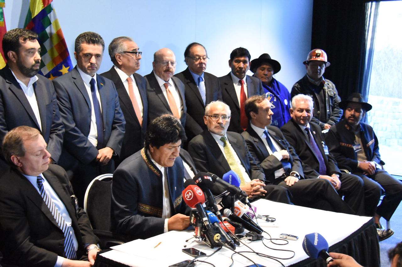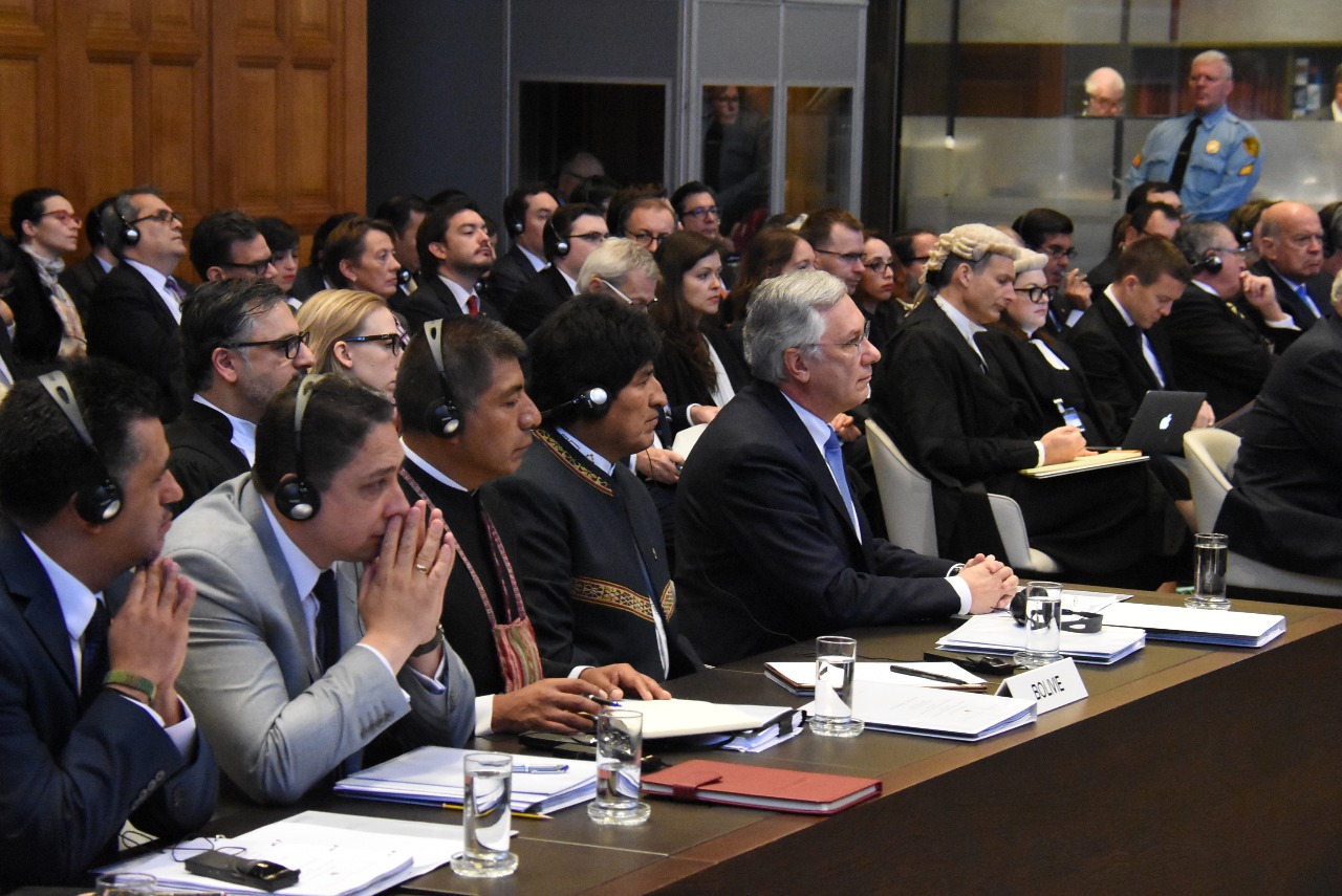 A la conclusión de la 1ra ronda de los alegatos orales por parte del equipo jurídico boliviano en la Corte Internacional de Justicia (CIJ) de La Haya, el Presidente del Estado Plurinacional de Bolivia, Evo Morales Ayma, brindó una conferencia de prensa para agradecer el trabajo realizado por el equipo jurídico, además de ratificar una vez más que lo único que pide el Estado boliviano es que Chile cumpla con sus varios compromisos de negociar una salida soberana al Océano Pacifico.