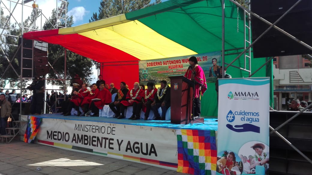 Hasta el municipio de Huarina, ubicado a 70 kilómetros de la ciudad de La Paz, llegó el Presidente Evo Morales Ayma junto al Canciller Fernando Huanacuni Mamani y los viceministros Carmen Almendras y Clarems Endara, para hacer entrega de la red de agua potable para el municipio de Chua Cocani, y la instalación de dos potabilizadoras de agua para Huatajata y Huarina.