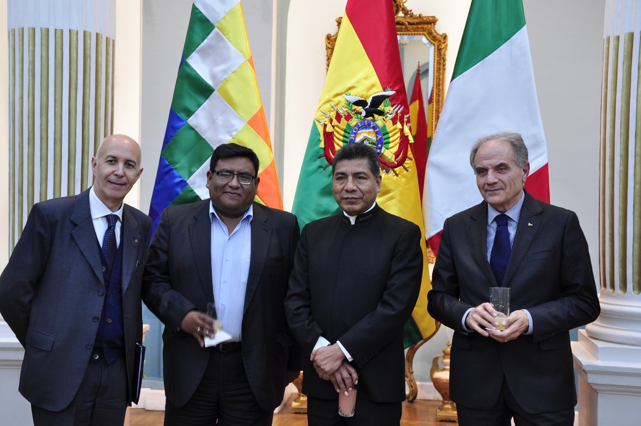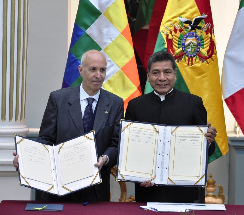 En el salón Tiwanaku de Cancillería, el Estado Plurinacional de Bolivia y el gobierno de la República Italiana firmaron un acuerdo para la ejecución del Programa “Cosechando Agua-Sembrando Luz: Componente Agua Segura (Segunda Fase)”, por un valor de 25 millones de euros; proyecto que beneficiará a más de 4800 familias de 25 municipios, de los departamentos de Oruro y Potosí.