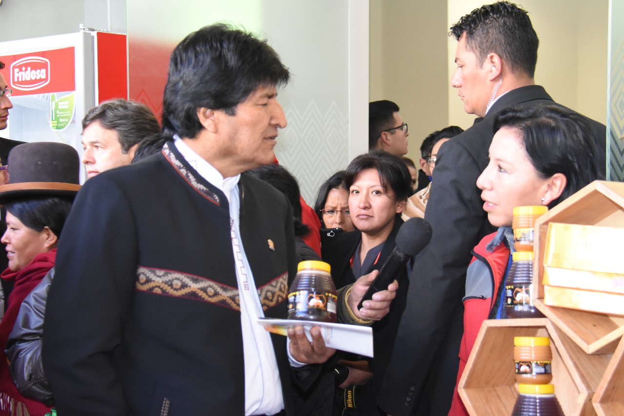 Bolivia | Presidente Morales y Canciller Huanacuni recorren los stand de los productores bolivianos, Campo Ferial Chuquiago Marka