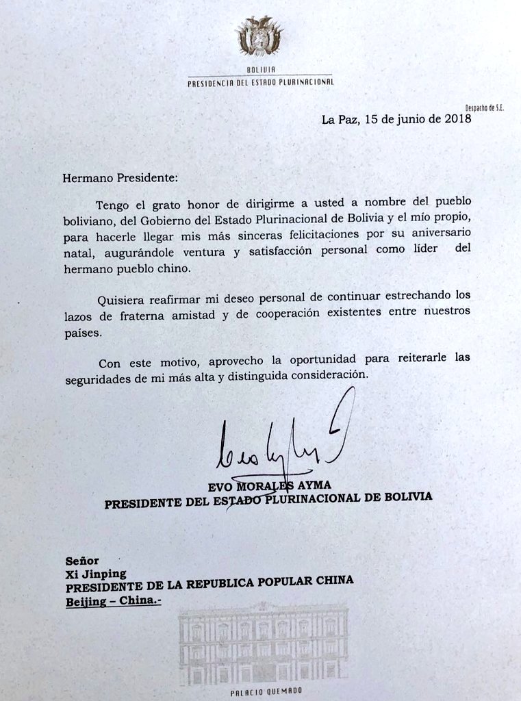 «El Presidente del Estado Plurinacional de Bolivia, Evo Morales Ayma mediante una nota oficial hizo llegar sus felicitaciones al Presidente de la República Popular de China, Xi Jinping por su aniversario natal, que celebra este 15 de junio del año en curso.