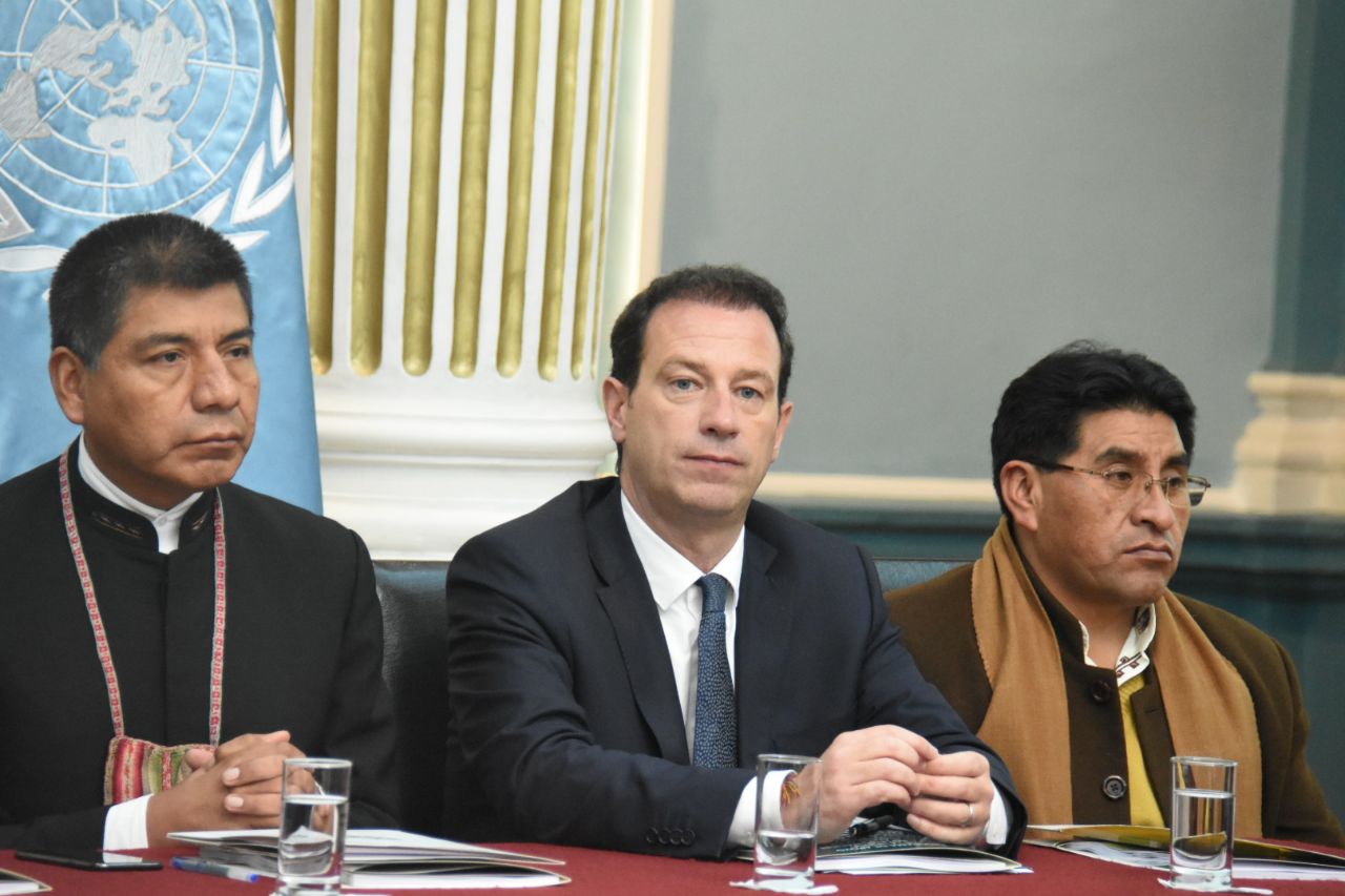 Bolivia | Canciller Fernando Huanacuni, representante de UNODC, Thierry Rostan y Ministro de Desarrollo Rural, Cesar Cocarico