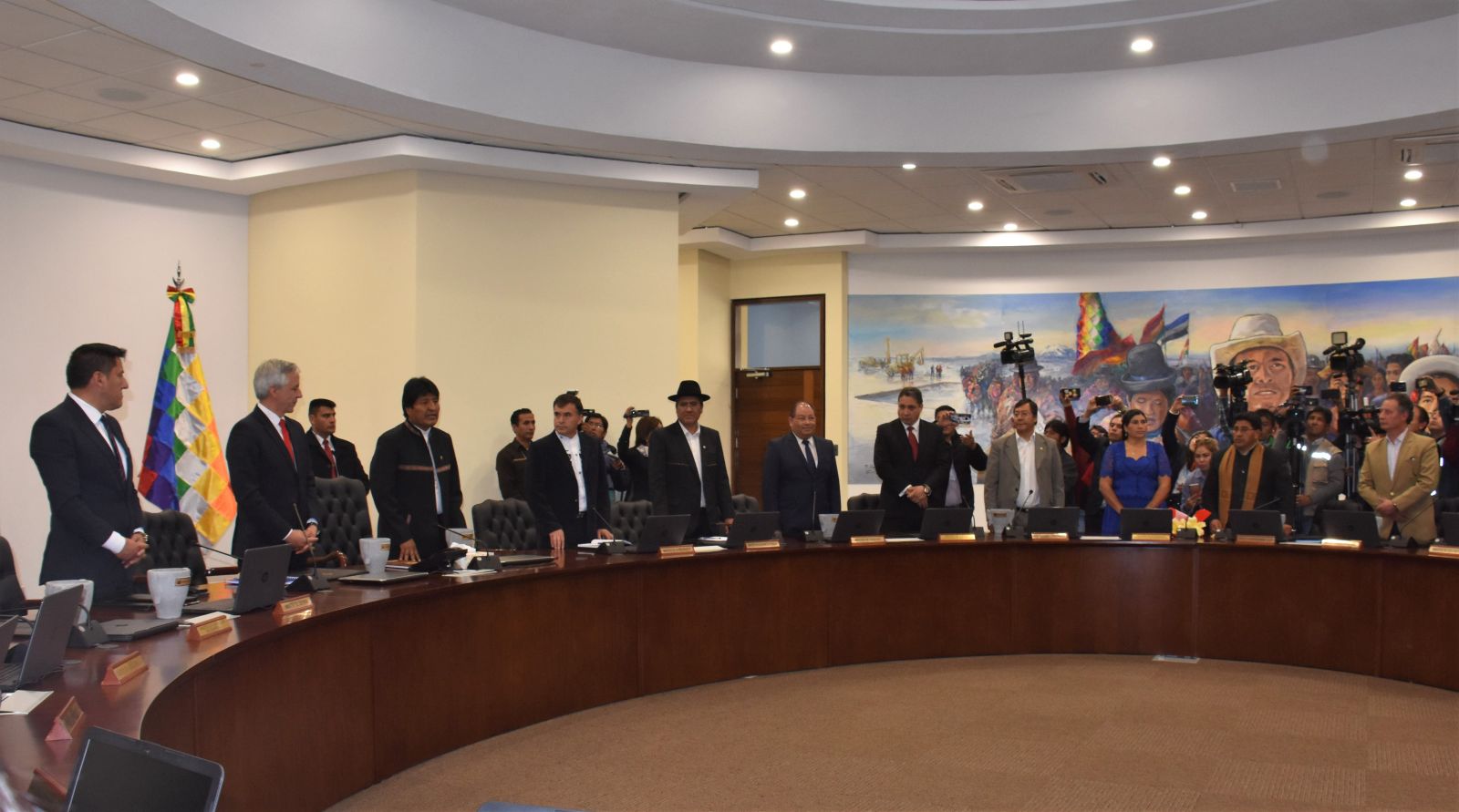En el hall central de la Casa Grande del Pueblo, el Presidente del Estado Plurinacional de Bolivia, Evo Morales Ayma, acompañado del Vicepresidente Álvaro García Linera, posesionó al nuevo Gabinete de Ministros para la gestión 2019 -2020.