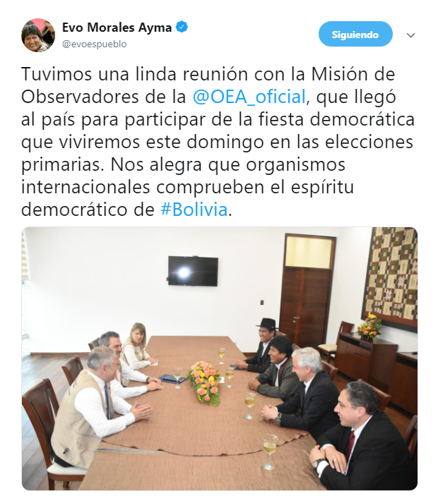 Al finalizar el encuentro, el primer mandatario, a través de su cuenta en twitter, ponderó la cita y expresó su alegría por la decisión tomada por los organismos internacionales para comprobar el espíritu democrático en Bolivia.