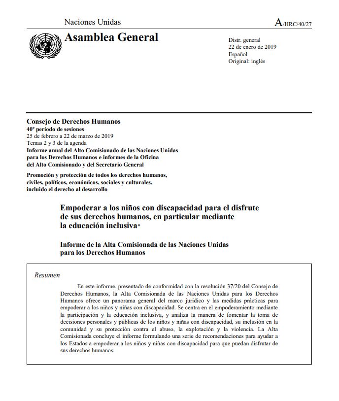 Durante el 40º periodo de sesiones del Consejo de Derechos Humanos, con sede en Ginebra, la Alta Comisionada de las Naciones Unidas para los Derechos Humanos, Michelle Bachelet, presentó el Informe “Empoderar a los niños con discapacidad para el disfrute de sus derechos humanos, en particular mediante la educación inclusiva”, de conformidad con la resolución 37/20 del Consejo de Derechos Humanos.