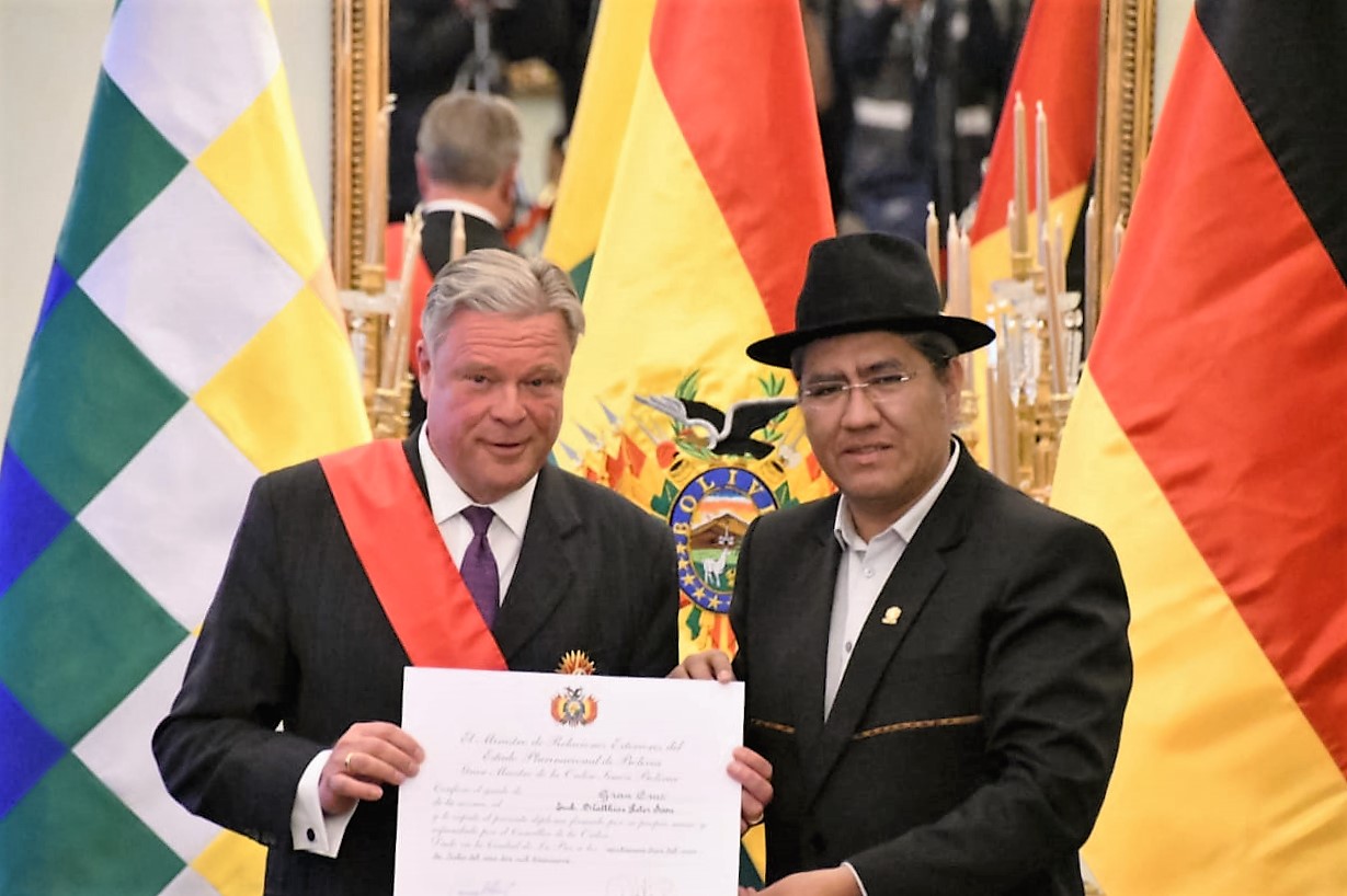El Estado Plurinacional de Bolivia otorgó la condecoración de la “Orden Simón Bolívar en Grado Cruz”, al Embajador de la República Federal de Alemania, Matthias Peter Sonn. La distinción fue entregada por el Ministro de Relaciones Exteriores, Diego Pary, al diplomático alemán que culminan su misión en nuestro país.
