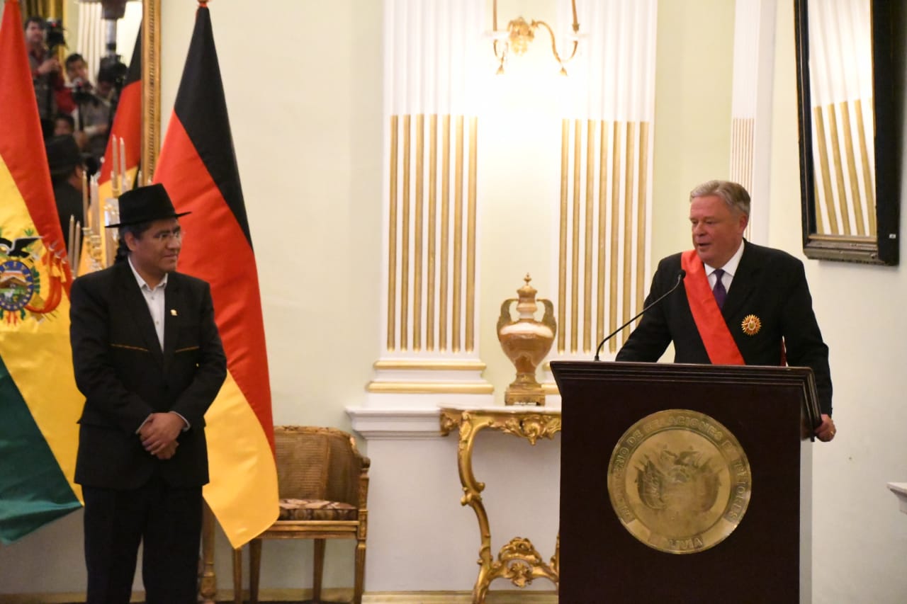 “Su trabajo estuvo caracterizado por la importante cooperación que Alemania brinda a Bolivia. La estrategia de cooperación diseñada por ambos países está inscrita en el marco de las prioridades y necesidades del pueblo boliviano, entre los que se destacan los programas de Agua y Saneamiento, desarrollo rural, medioambiente, energía, entre otros”, subrayó el Canciller Pary luego de imponer la distinción.