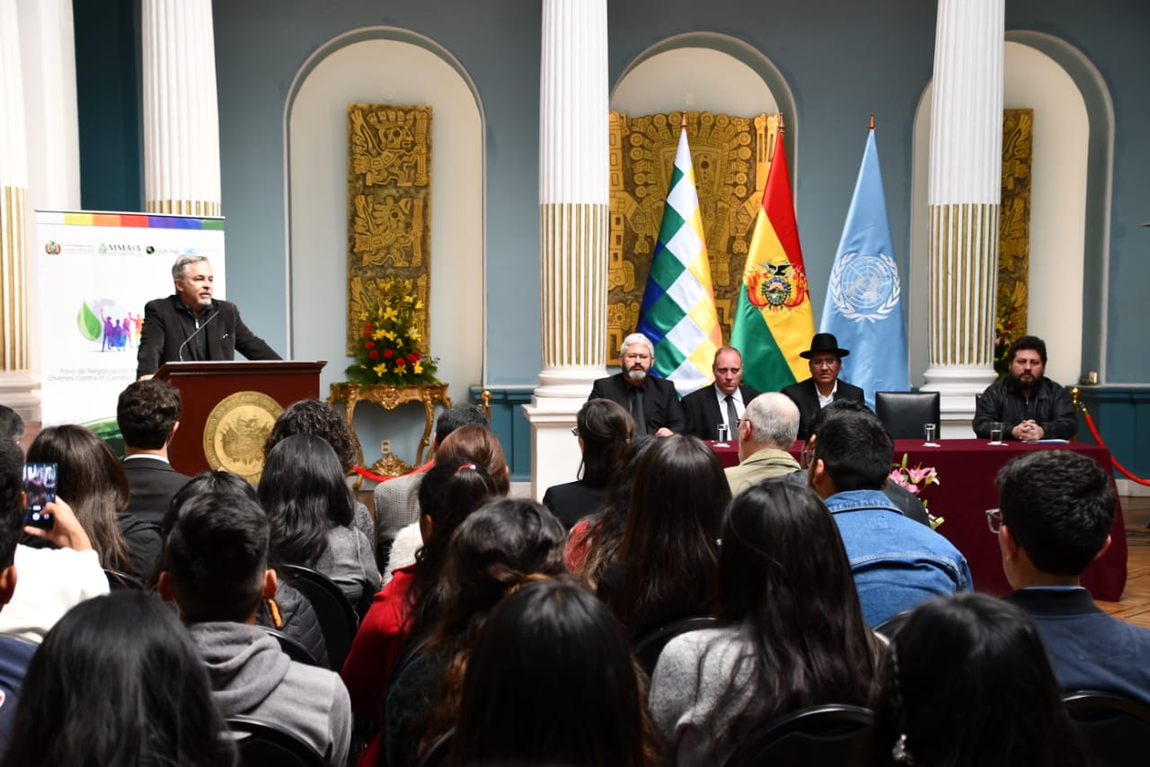 “Para combatir la crisis del Cambio Climático, Bolivia apuesta por el Multilateralismo que se encuentra en la Carta de las Naciones Unidas (…) en ese marco llevamos adelante este Foro para conocer cómo los jóvenes perciben el Cambio Climático y sus propuestas”, explicó Pary.