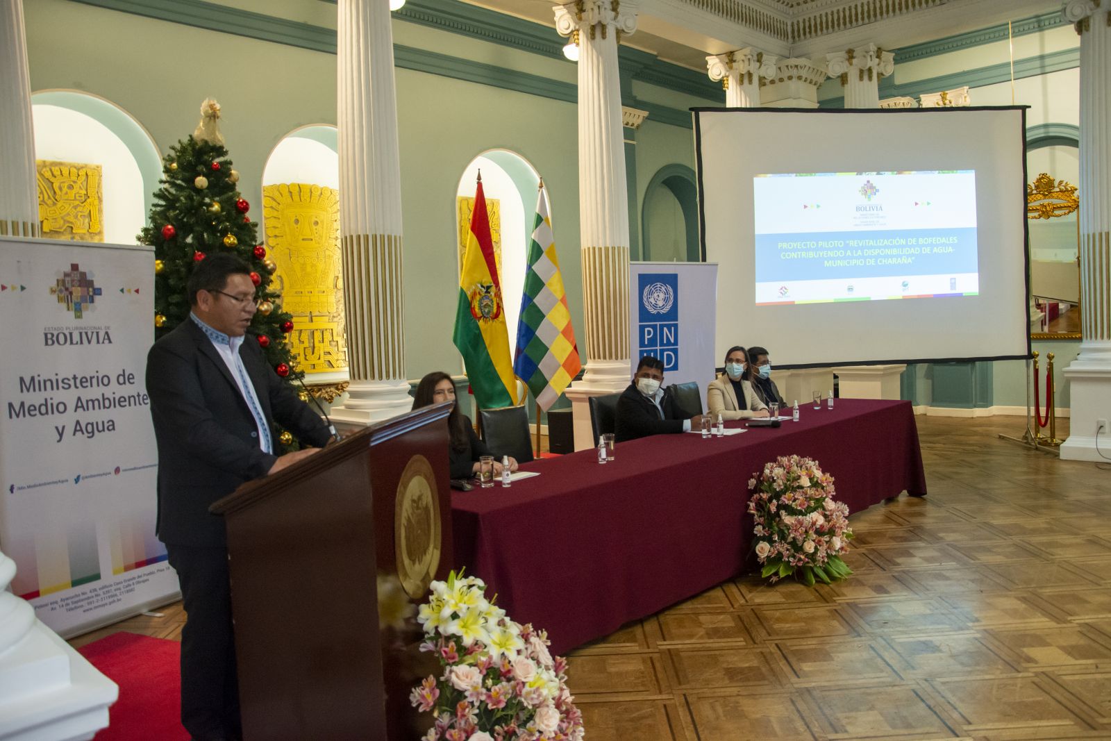 Este 01 de diciembre de 2021 en el Salón Tiwanaku de Cancillería, el Emb. Freddy Erwin Mamani Machaca, Viceministro de Relaciones Exteriores, inauguró la presentación de los resultados obtenidos del Proyecto Piloto “Revitalización de bofedales contribuyendo a la disponibilidad de agua – Municipio de Charaña”.