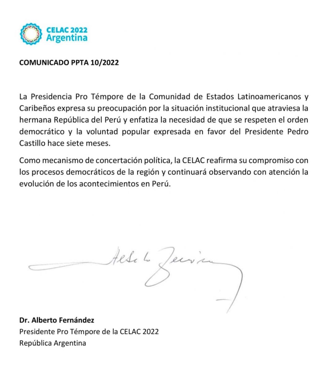 El Ministerio de Relaciones Exteriores del Estado Plurinacional de Bolivia comparte la preocupación expresada por el Presidente de la República de Argentina y Presidente Pro Témpore de la Comunidad de Estados Latinoamericanos y Caribeños (CELAC), Alberto Fernández, por la situación institucional en la hermana República del Perú, es necesario que se respete la institucionalidad democrática y la voluntad popular expresada en favor del Presidente Pedro Castillo.