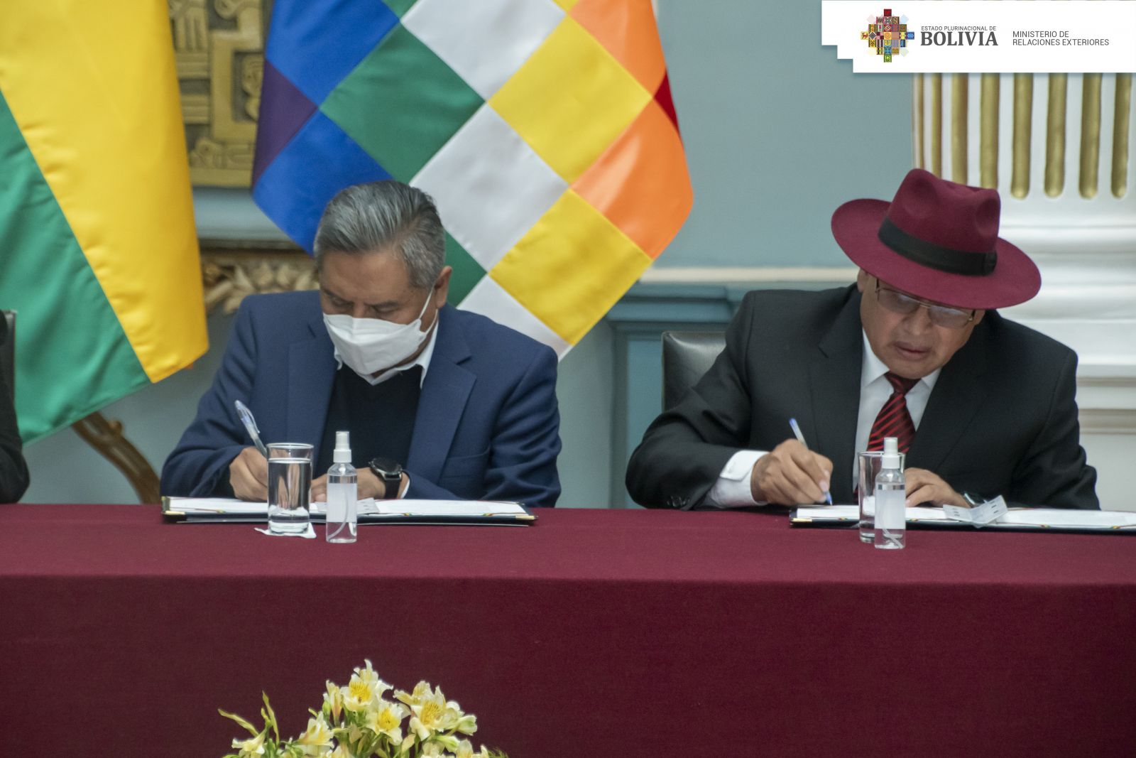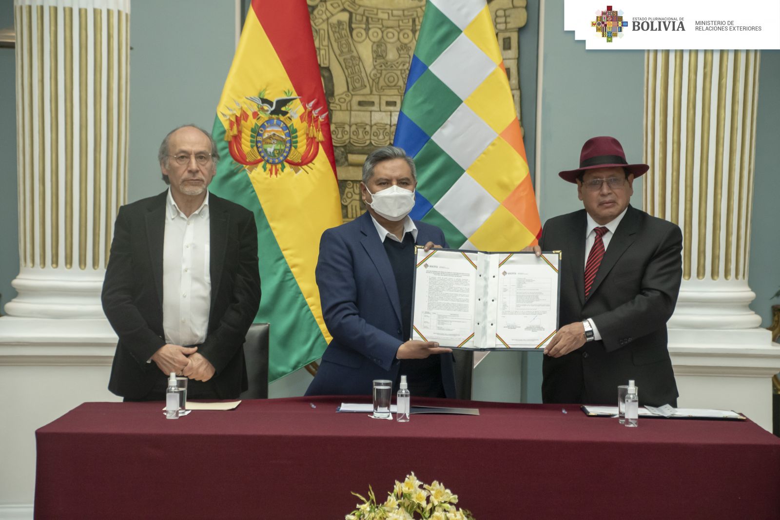 La Paz, 21 de abril de 2022.- El ministro de Relaciones Exteriores, Rogelio Mayta junto al embajador de los Países Bajos, Roberto Calzadilla, realizaron la entrega de obras pictóricas y materiales educativos que fueron realizadas por la artista holandesa Gezien van de Riet, al presidente del Consejo de Administración de la Fundación Cultural del Banco Central de Bolivia (FC BCB), Luis Oporto Ordoñez.