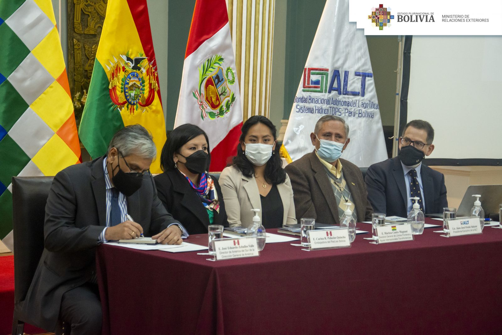 La Paz, 28 de junio de 2022.- El Ministerio de Relaciones Exteriores de Bolivia junto al Ministerio de Relaciones Exteriores del Perú y su comitiva, participaron de la presentación del último inventario de las fuentes contaminantes de la calidad del recurso hídrico de la cuenca del lago Titicaca en Bolivia, a cargo de la Autoridad Binacional del Lago Titicaca (ALT).