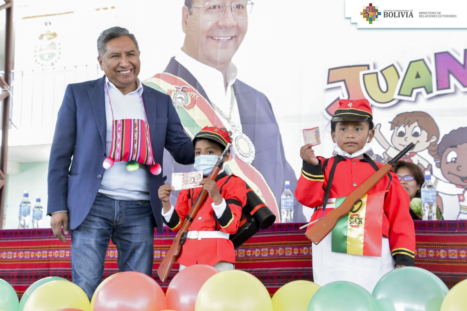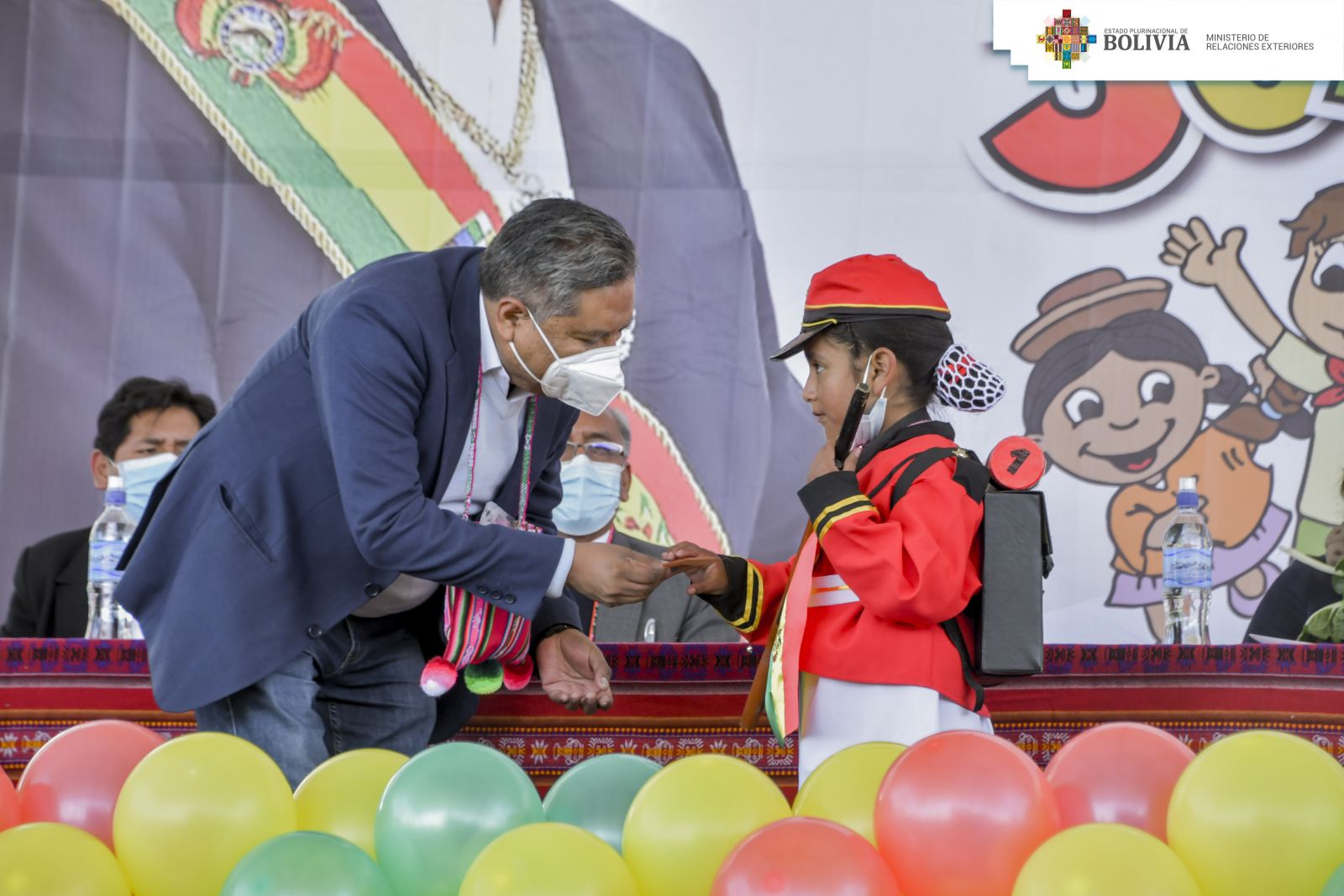 La Paz, 24 de octubre de 2022.– La mañana de este lunes el ministro de Relaciones Exteriores, Rogelio Mayta acompañado de diversas autoridades, participó de la inauguración de la entrega del Bono Juancito Pinto, el cual beneficiará a más de cientos estudiantes de las Unidades Educativas, Marcelo Quiroga Santa Cruz y Antonio Díaz Villamil, en la localidad de Achocalla