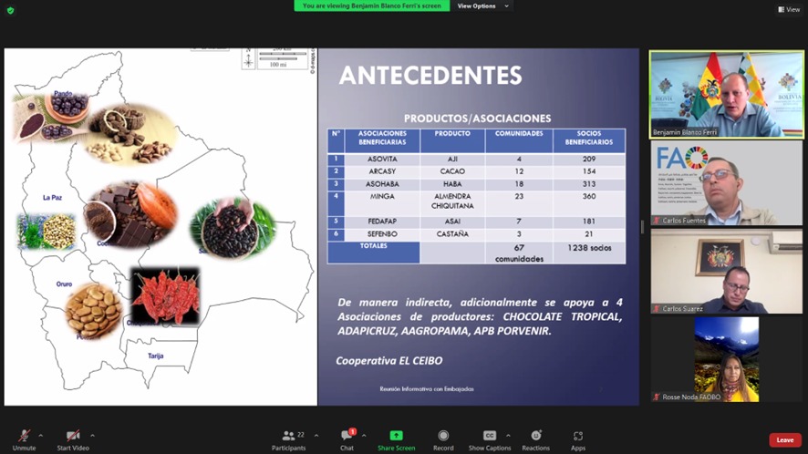 El Viceministerio de Comercio Exterior e Integración, Benjamín Blanco, y la Organización de Naciones Unidas para la Alimentación y la Agricultura (FAO por sus siglas en inglés), en reunión con Misiones Diplomáticas, presentaron los productos potencialmente exportables como el cacao en grano y derivados, castaña, almendra chiquitina, ají molido, asaí liofilizado, miel, haba, entre otros, con el objetivo de promocionar los productos en el mercado internacional.