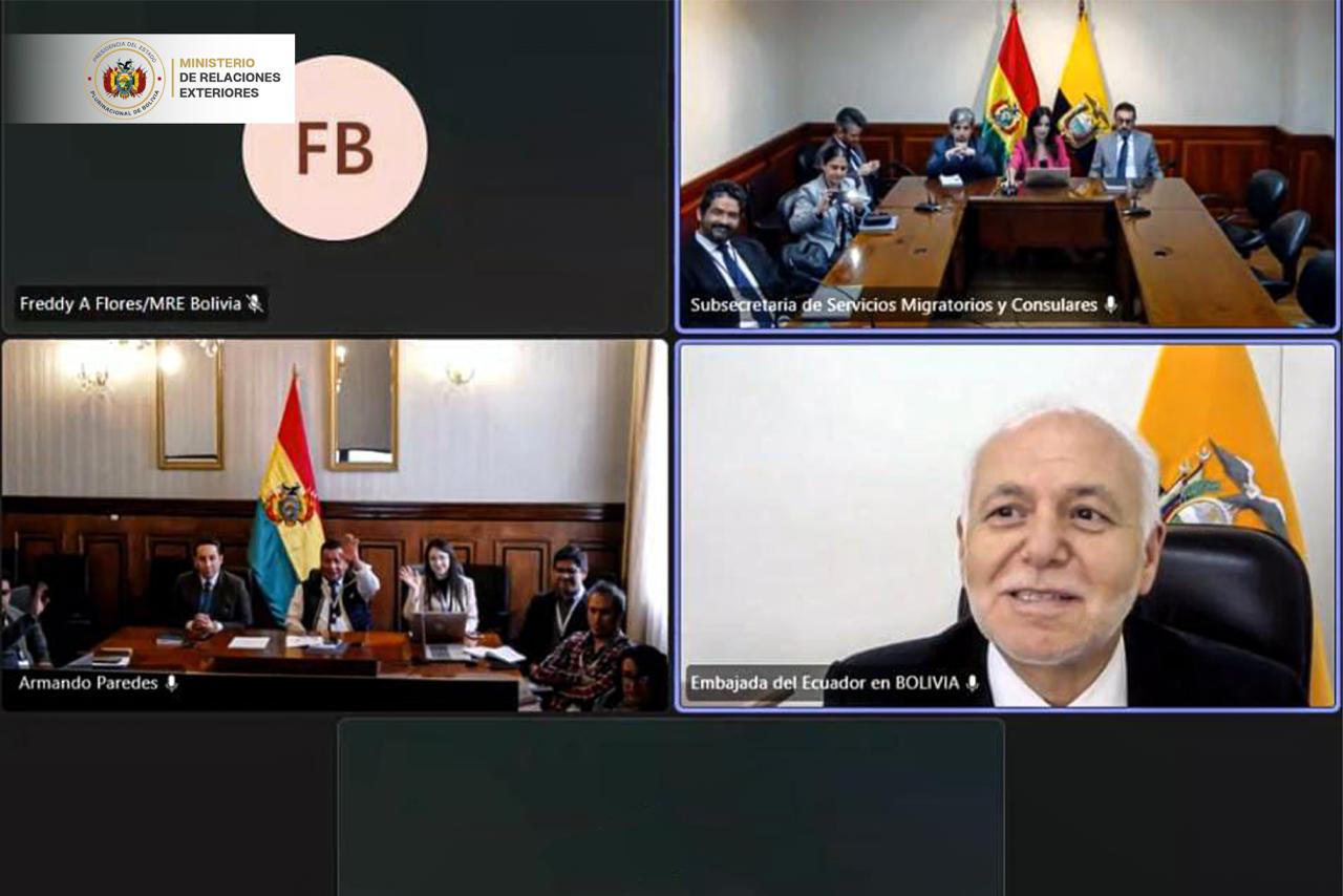 El Viceministerio de Gestión Consular e Institucional del Ministerio de Relaciones Exteriores de Bolivia sostuvo una reunión virtual de trabajo con el Viceministerio de Movilidad Humana del Ministerio de Relaciones Exteriores y Movilidad Humana de la República del Ecuador y su equipo técnico, con el objetivo de intercambiar experiencias en la modernización y digitalización de los servicios consulares.