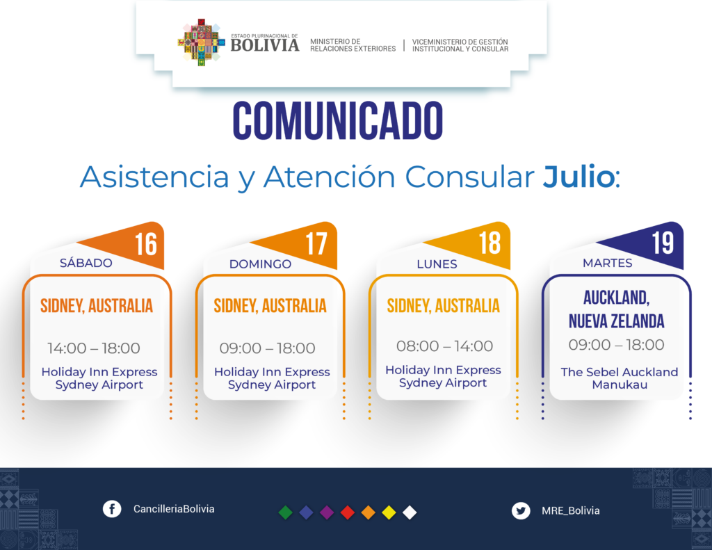 La Paz 8 de julio de 2022.- La Cancillería de Bolivia realizó las gestiones con las autoridades competentes para prestar servicios de asistencia y atención consular a la comunidad boliviana residente en Sídney, Australia y en Auckland, Nueva Zelanda.