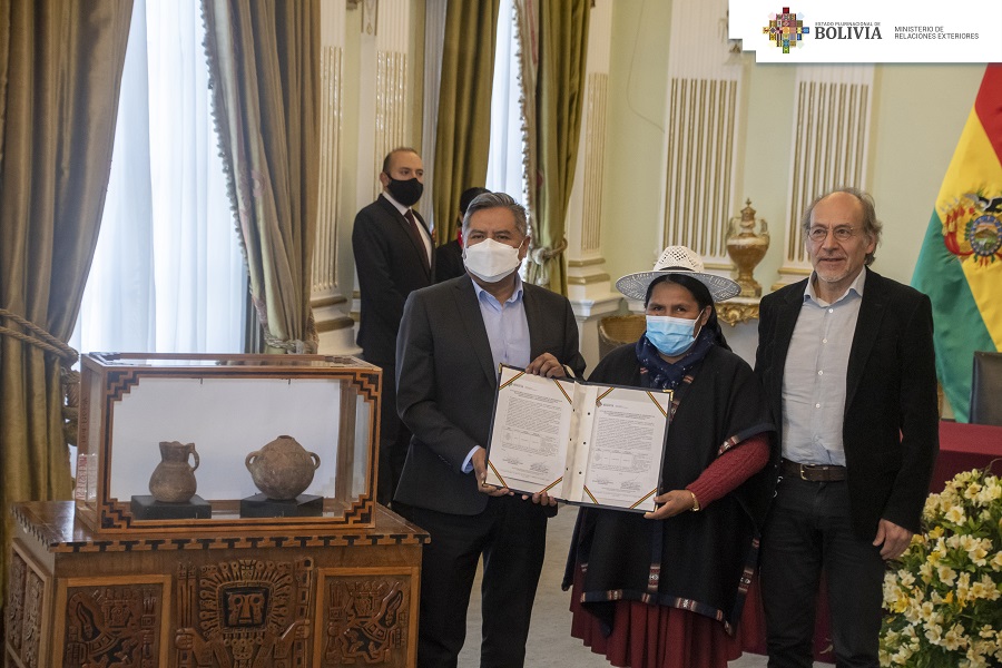 La Paz, 20 de abril de 2022. – En el marco de la Ley N° 530 sobre el Patrimonio Cultural Boliviano, el ministro de Relaciones Exteriores, Rogelio Mayta, realizó la entrega de bienes culturales, que consta de dos vasijas precolombinas auténticas, a la ministra de Culturas, Descolonización y Despatriarcalización, Sabina Orellana Cruz, tras la verificación ocular de las dos piezas que corresponden a la filiación cultural Mollo, que data entre 700 a 1400 d.C.