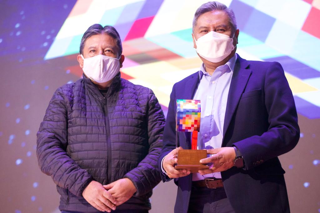 La Paz, 20 de abril de 2022. – El Canciller Rogelio Mayta, a nombre del Ministerio de Relaciones Exteriores, fue galardonado con el primer lugar del “Premio a la Innovación Tecnológica”, por el desarrollo de productos o servicios realizados a partir de la Firma Digital, en la aplicación del Sistema Integrado de la Apostilla (SIA).