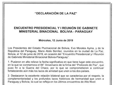 [Presidentes Abdo Benítez y Evo Morales suscribieron la “Declaración de la Paz”]