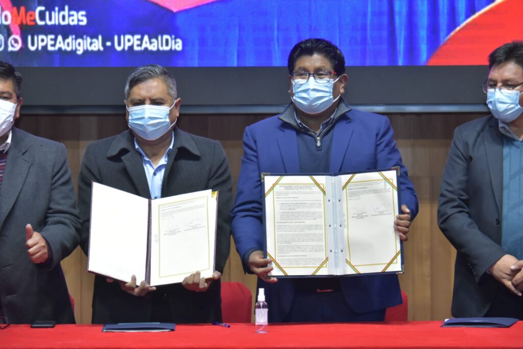 El ministro de Relaciones Exteriores, Rogelio Mayta, firmó este martes un acuerdo con el rector de la Universidad Pública El Alto (UPEA), Carlos Condori, que permitirá que los estudiantes de esa casa de estudios superiores realicen prácticas en esta cartera de Estado.