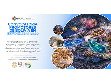 El Ministerio de Relaciones Exteriores del Estado Plurinacional de Bolivia convoca a jóvenes para resaltar la participación de Bolivia en la Expo Dubái 2020 en los ámbitos de difusión de resultados y gestión de negocios en beneficio de Bolivia entre octubre de 2021 a marzo de 2022.