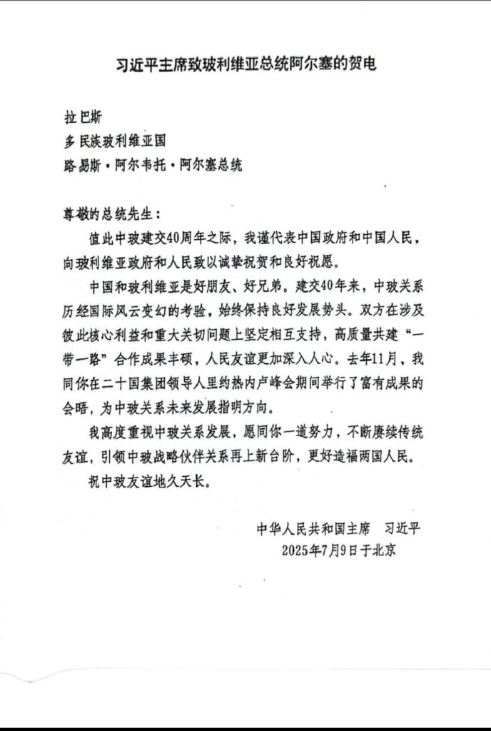 Por su parte, el presidente Xi Jinping subrayó que Bolivia y China son “buenos amigos y buenos hermanos”, y resaltó que, a lo largo de estas cuatro décadas, las relaciones bilaterales han superado los desafíos del escenario internacional, manteniendo un desarrollo sostenido y positivo. Destacó también el respaldo mutuo en temas de interés fundamental y los avances logrados en el marco de la Iniciativa de la Franja y la Ruta, que han fortalecido la cooperación estratégica y acercado aún más a ambos pueblos.