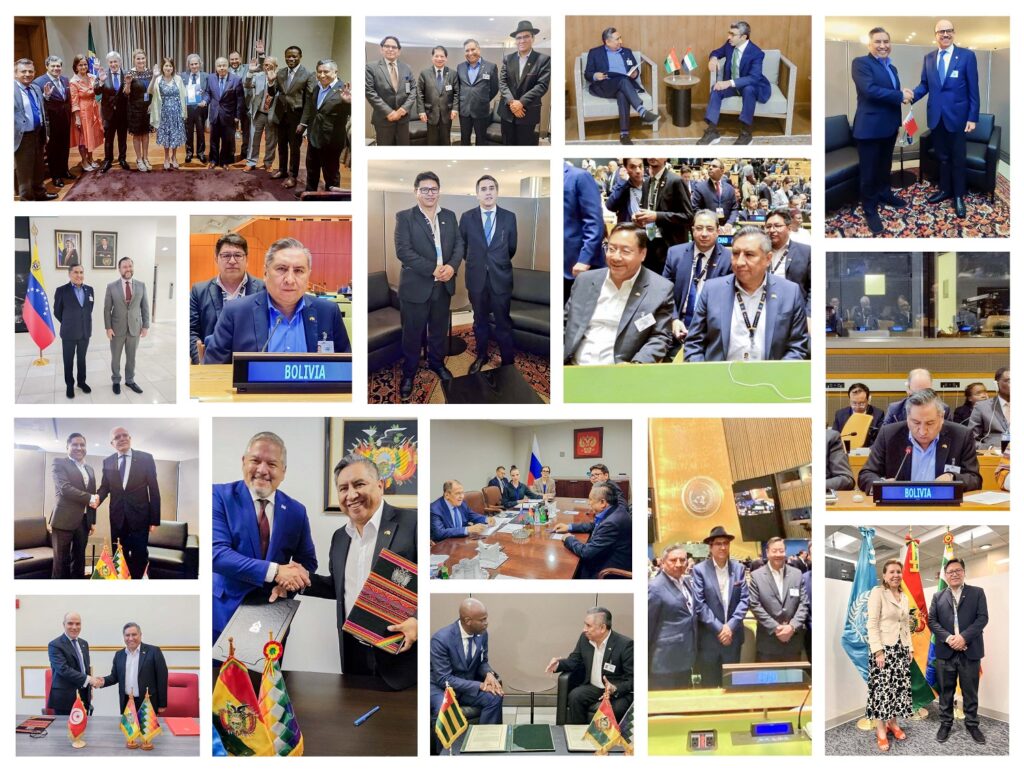 La Paz, 26 de septiembre de 2023.- En un impresionante despliegue de diplomacia de los pueblos, Bolivia participó activamente en semana de alto nivel de la 78ª Asamblea General de las Naciones Unidas, consolidando relaciones bilaterales y marcando hitos en su compromiso con la cooperación internacional. La delegación boliviana estuvo encabezada por el presidente Luis Arce, el Ministro de Relaciones Exteriores Rogelio Mayta y el Vicecanciller Freddy Mamani, quienes sostuvieron 13 reuniones bilaterales que subrayan la importancia de la diplomacia en la política exterior del país.